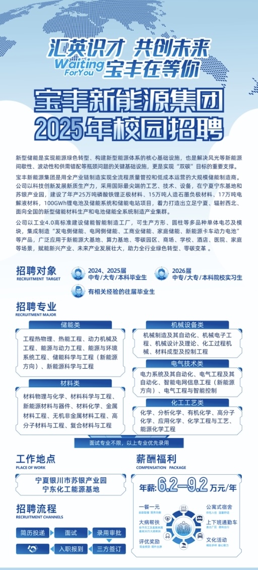 宝丰新能源集团作为以科技创新驱动新质生产力发展的行业领先企业,现正式启动2025届校园招聘,诚挚邀请有志学子加入我们,共同投身新能源储能事业,为实现“双碳”目标贡献力量!