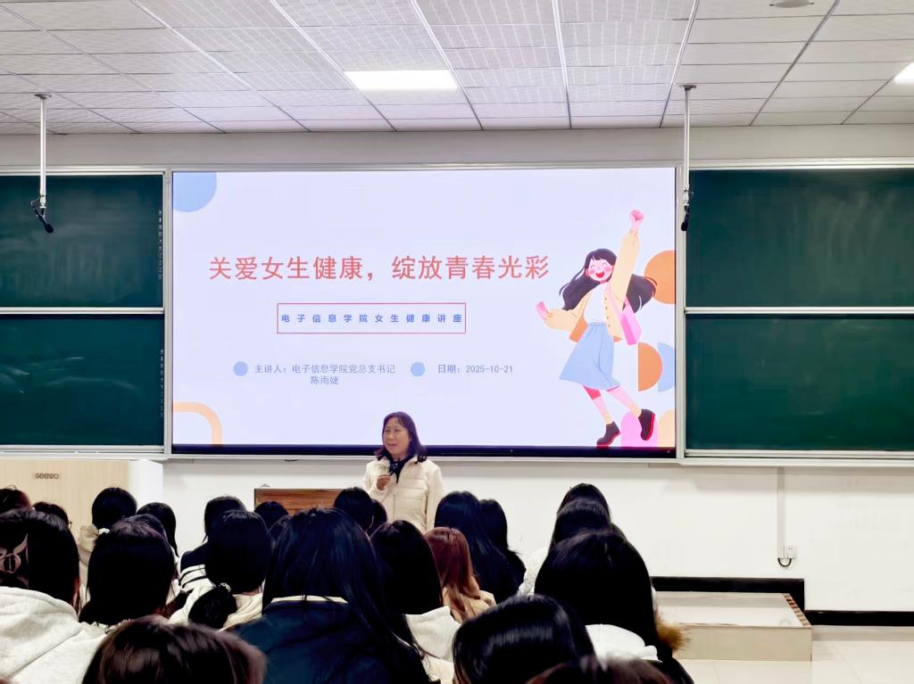 为关心女大学生身心健康,帮助和引导她们解决成长过程中的困惑,进一步增强其安全防范意识和自我保护能力,助力女生树立“自尊、自爱、自强”的价值理念,使其能以自信从容、积极昂扬的心态面对大学生活,电子信息学院于10月21日晚在工程实训大楼阶梯教室开展了以“关爱女生健康,绽放青春光彩”为主题的女生专属讲座。此次讲座由电子信息学院党总支书记陈雨婕主讲,学院辅导员陈秋霞协助参与,电子信息学院130名大一女生现场聆听。